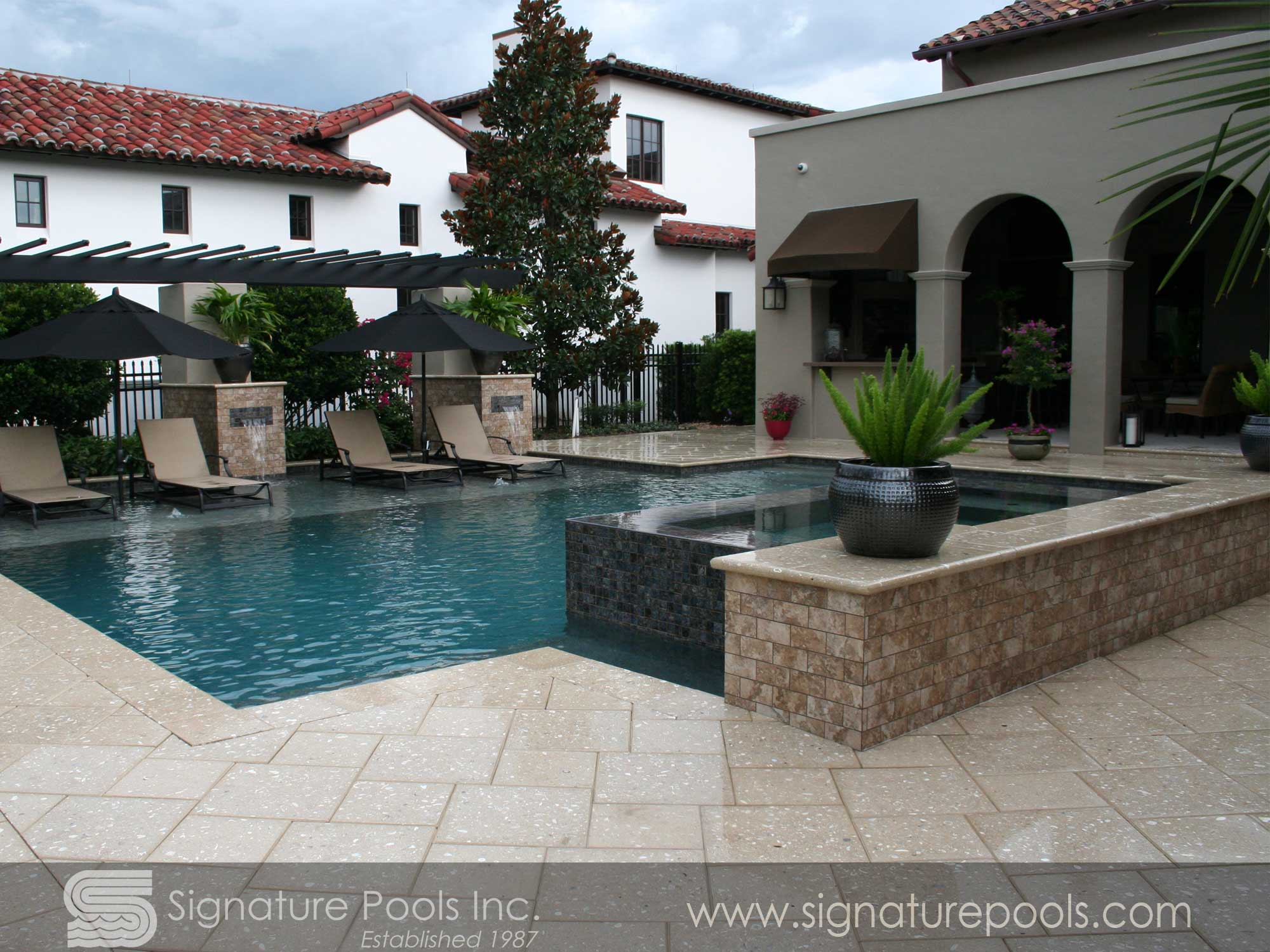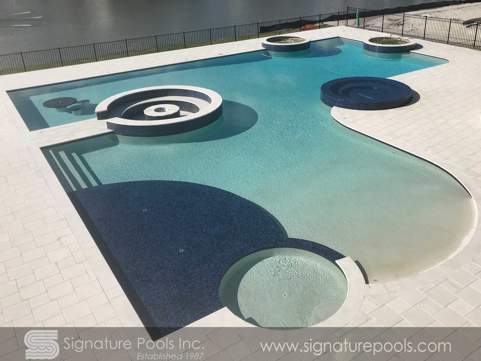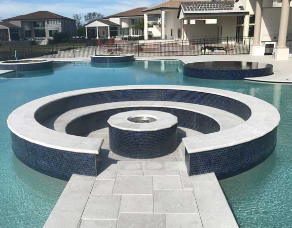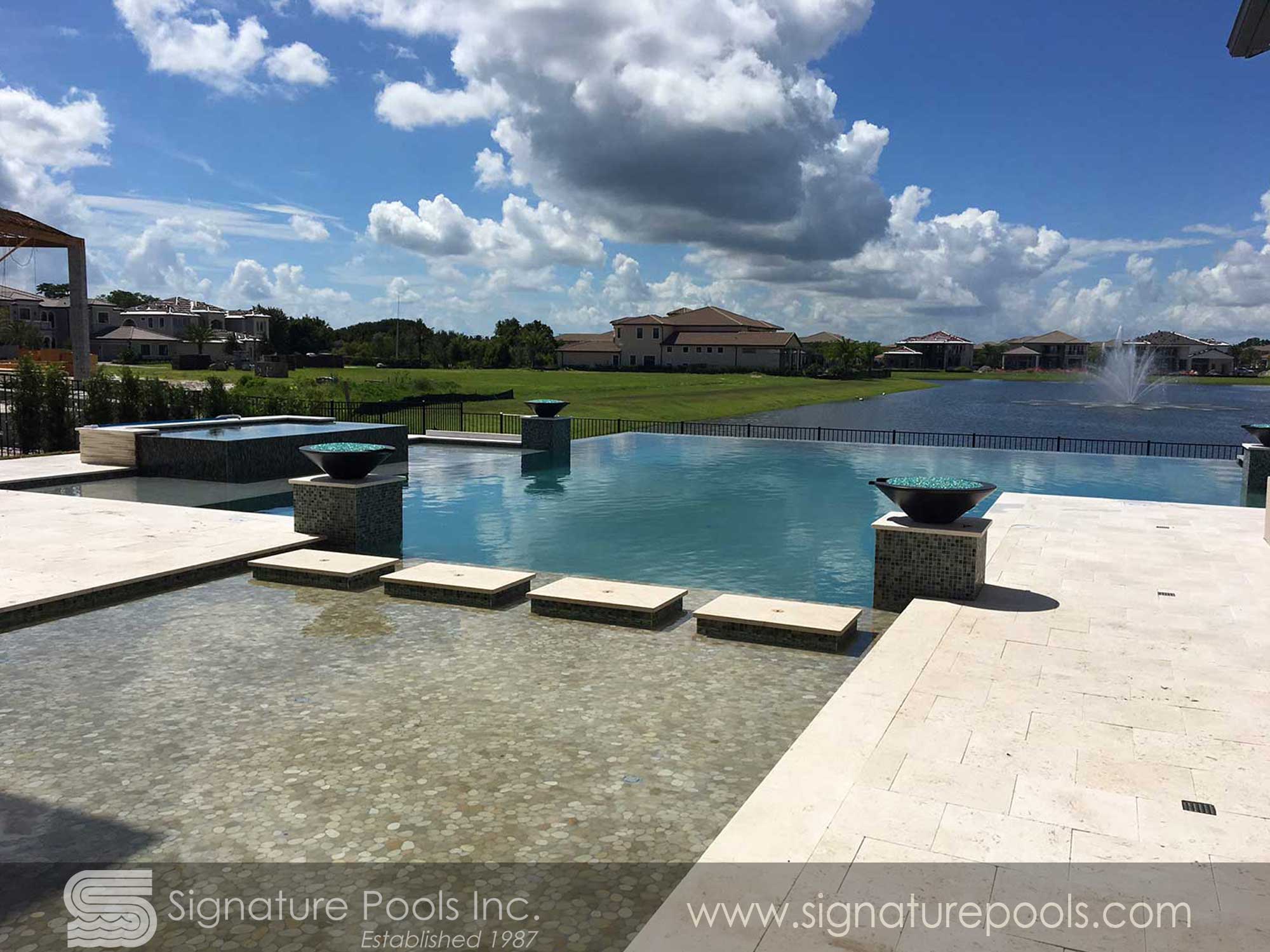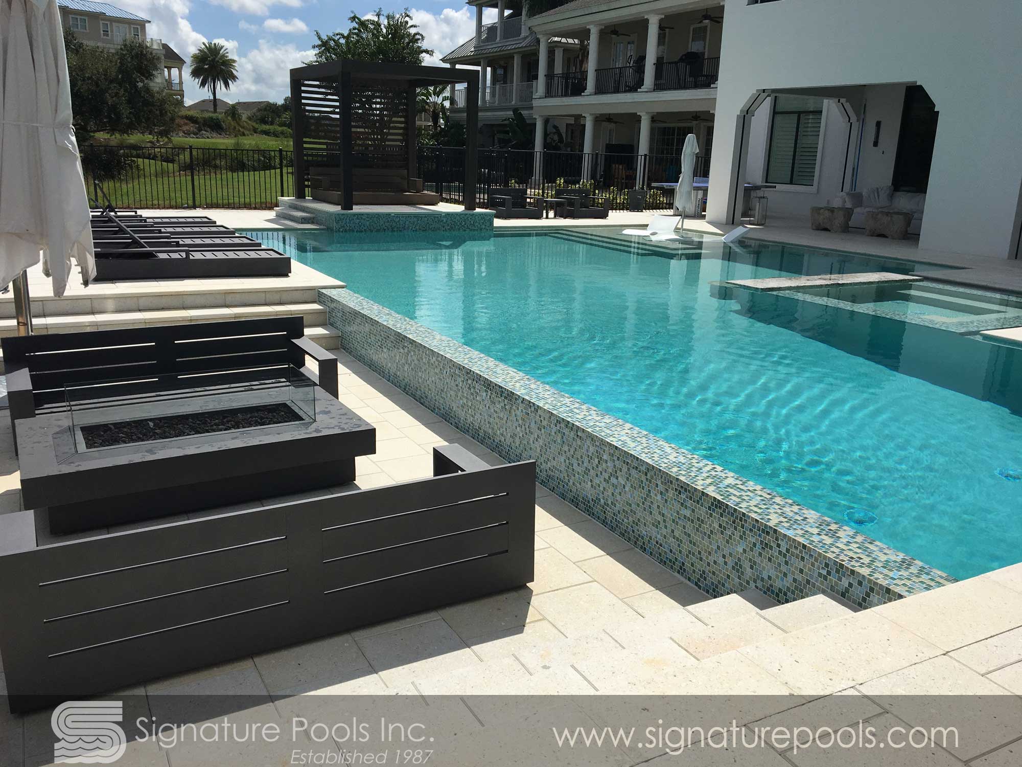 Curvilinear Pool Design with Sunken Fire Pit Overflow Spa Zero Entry