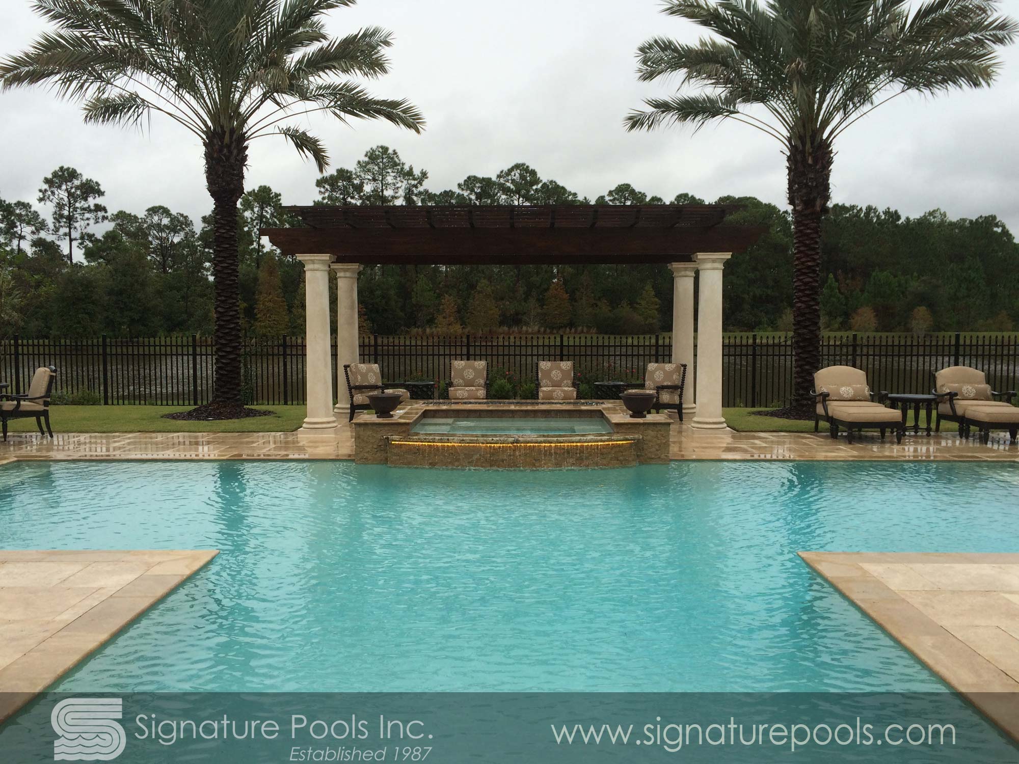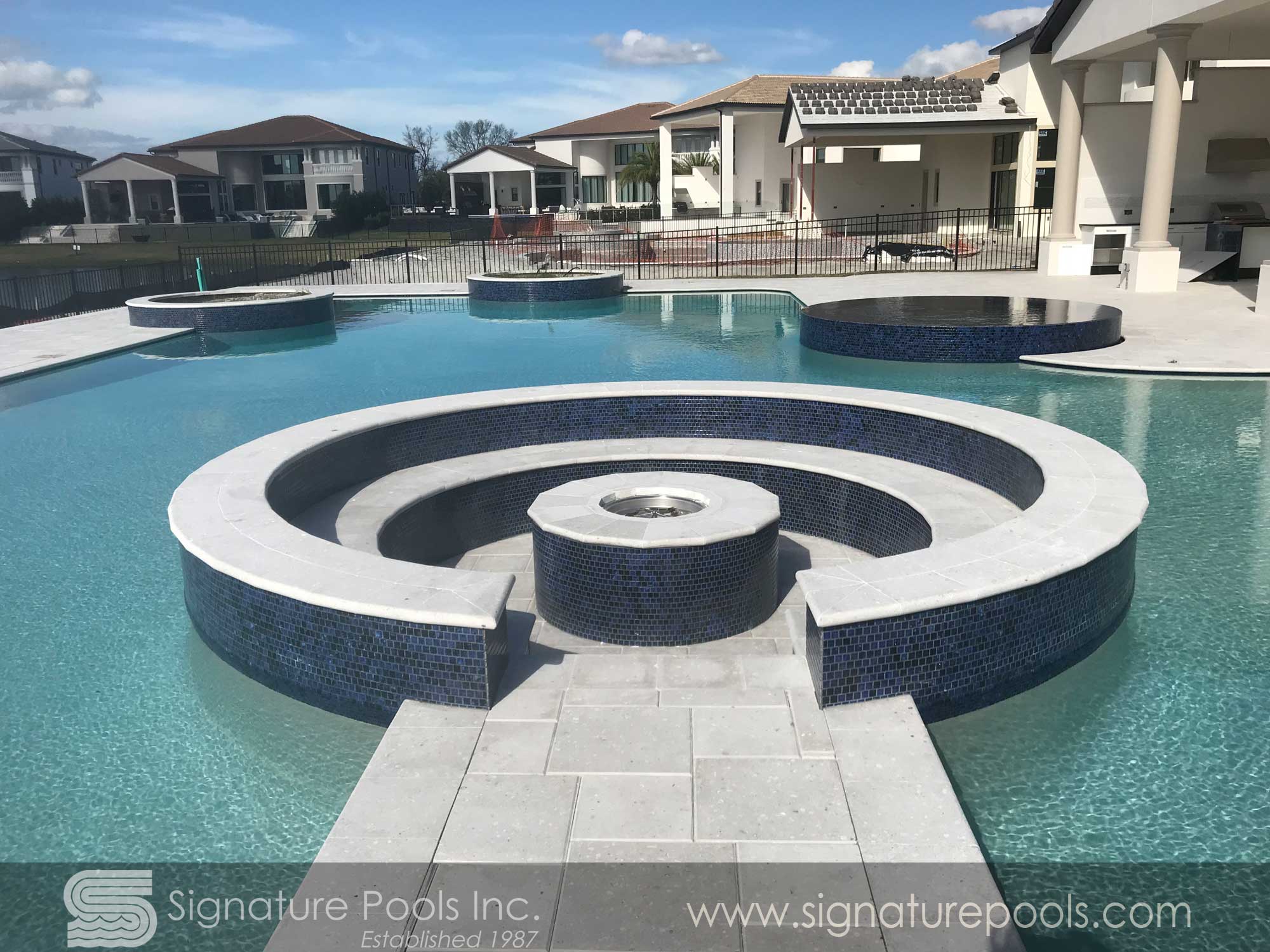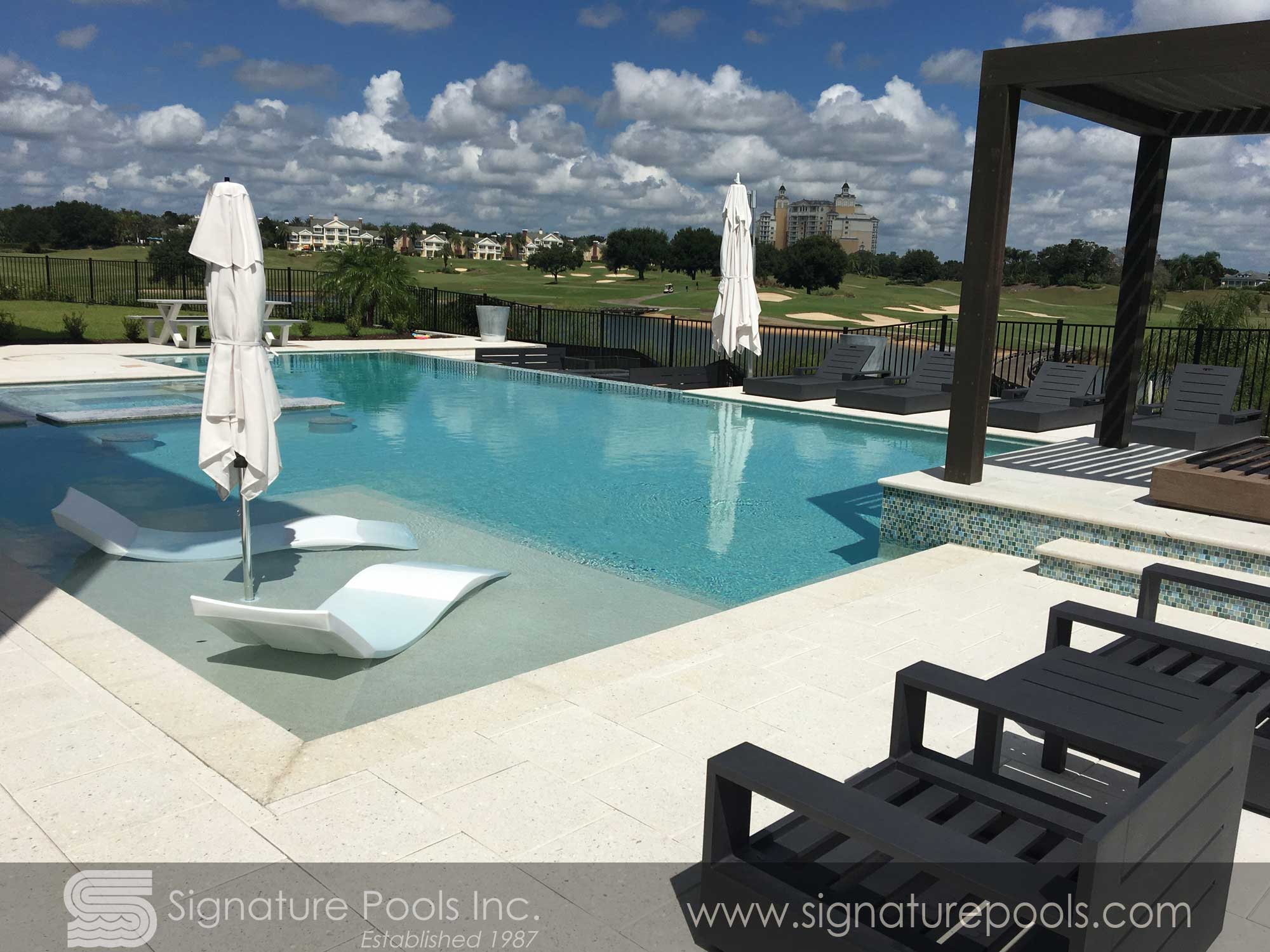Curvilinear Pool Design with Sunken Fire Pit Overflow Spa Zero Entry
