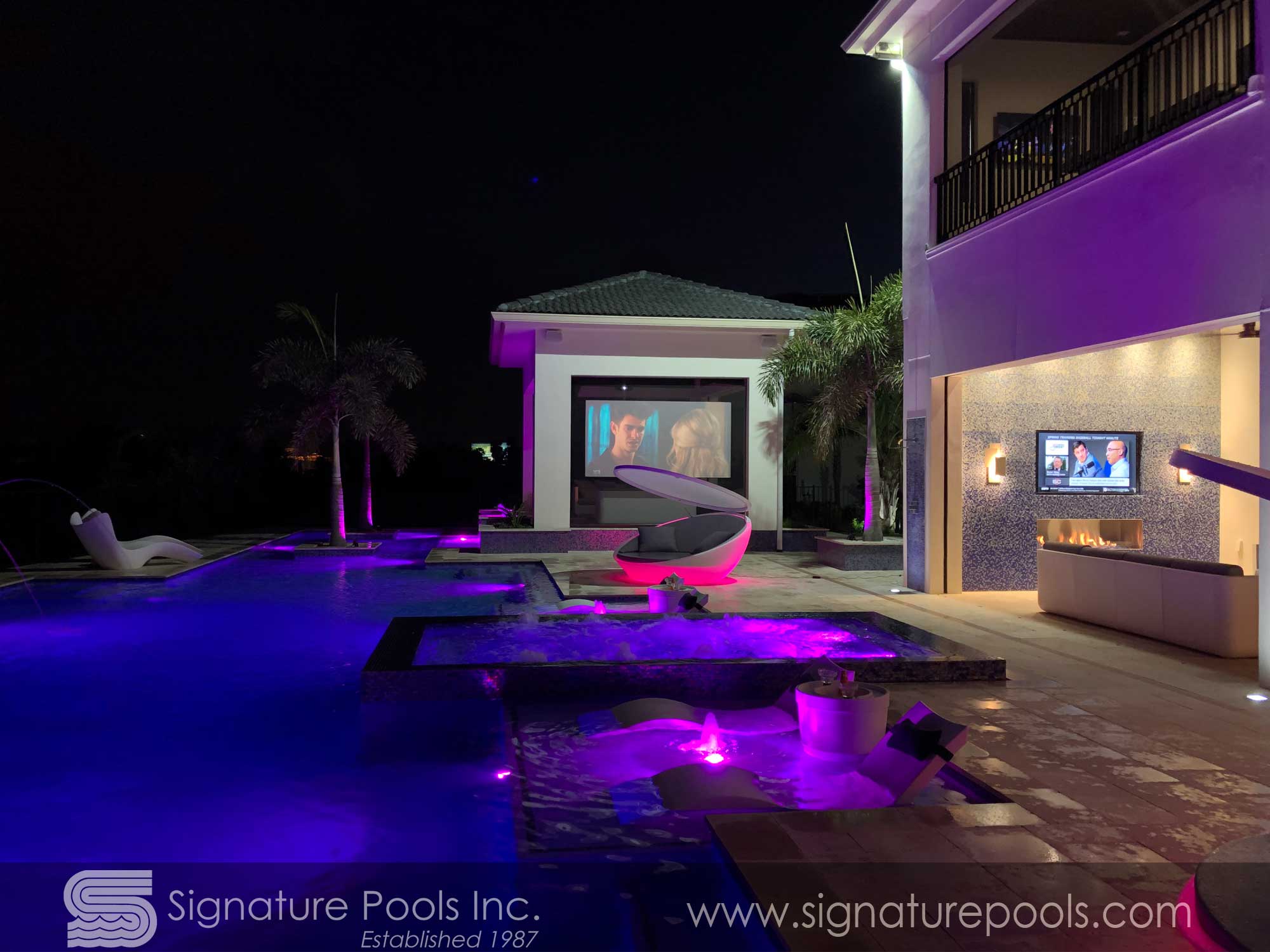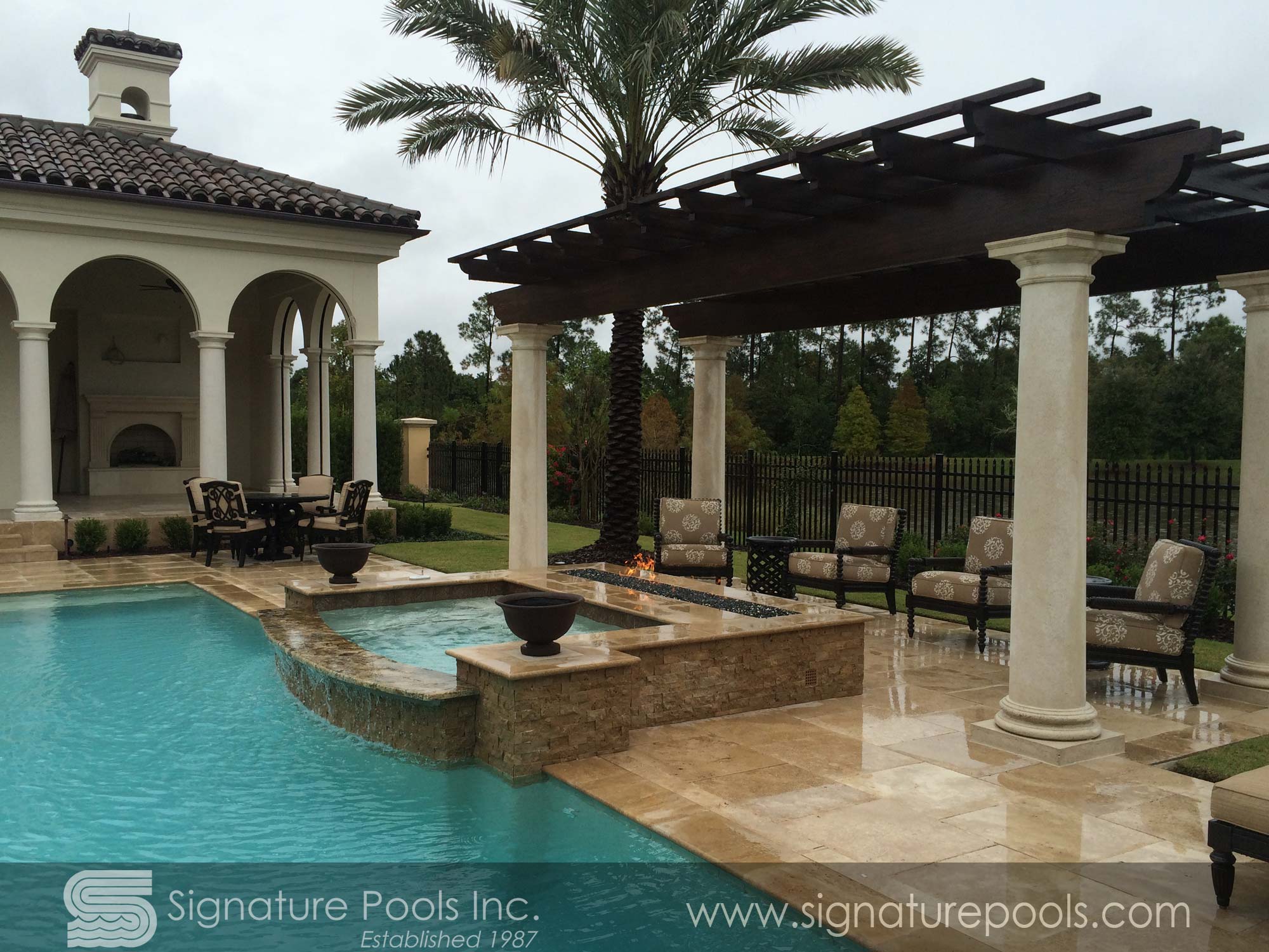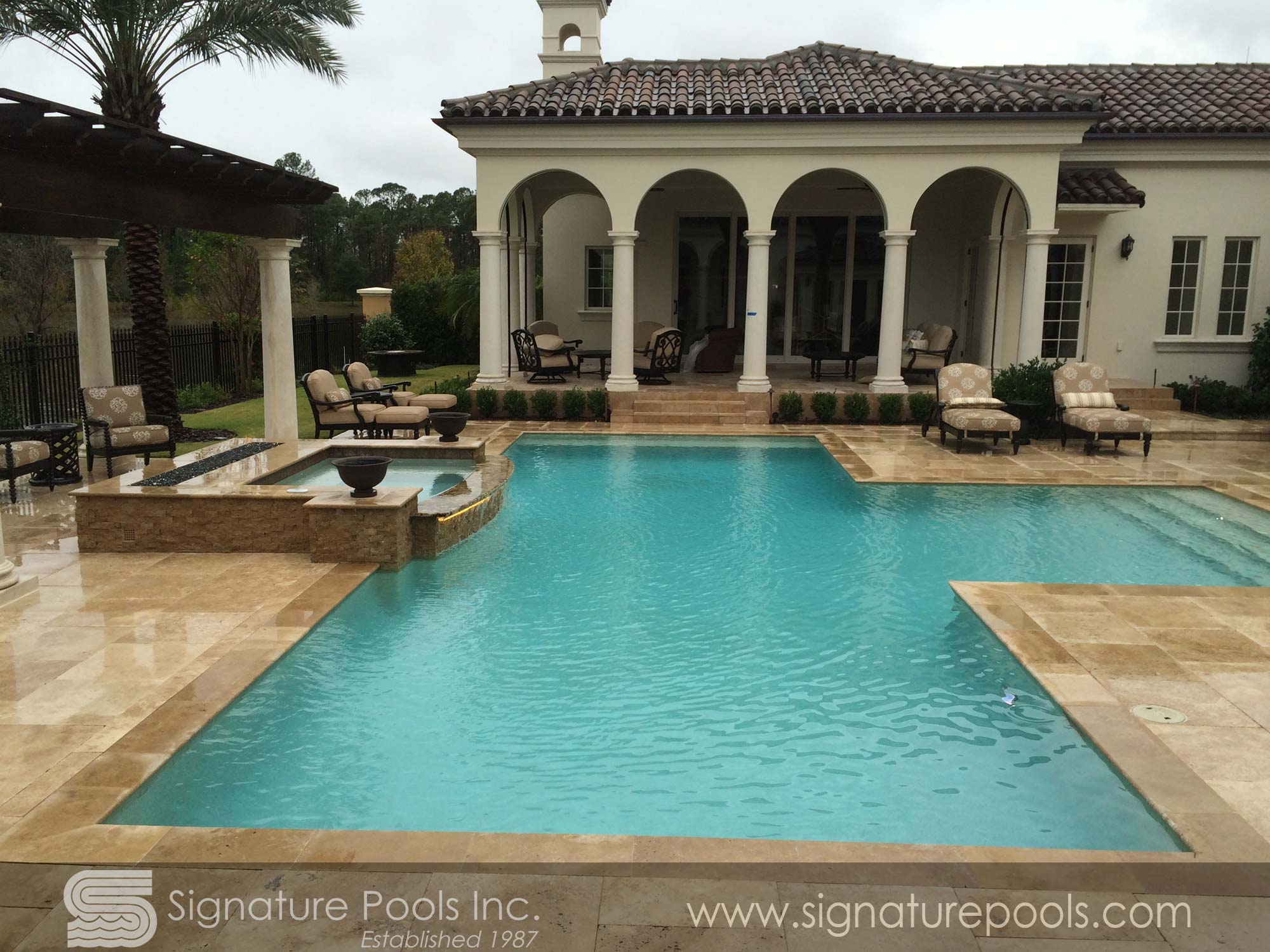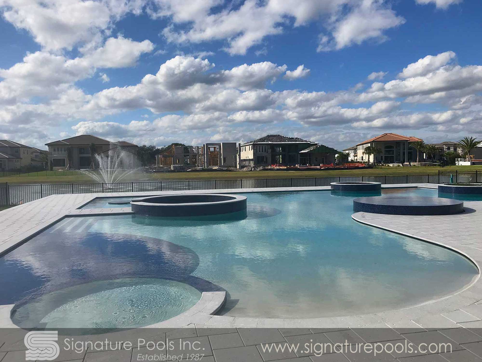 Curvilinear Pool Design with Sunken Fire Pit Overflow Spa Zero Entry