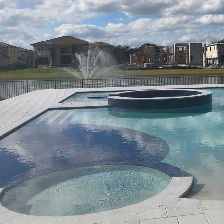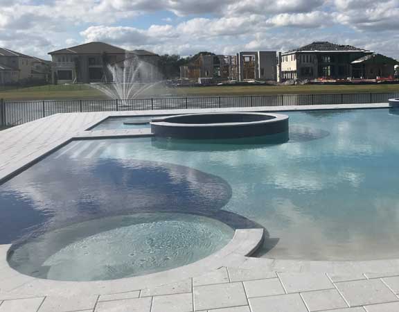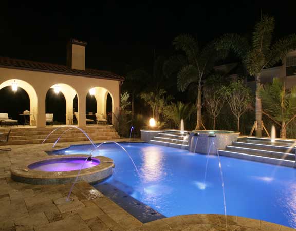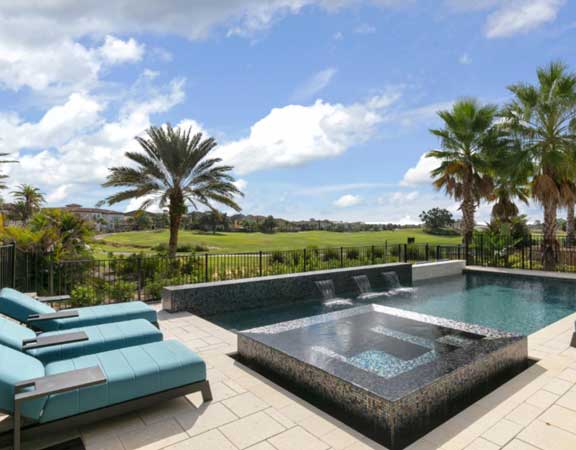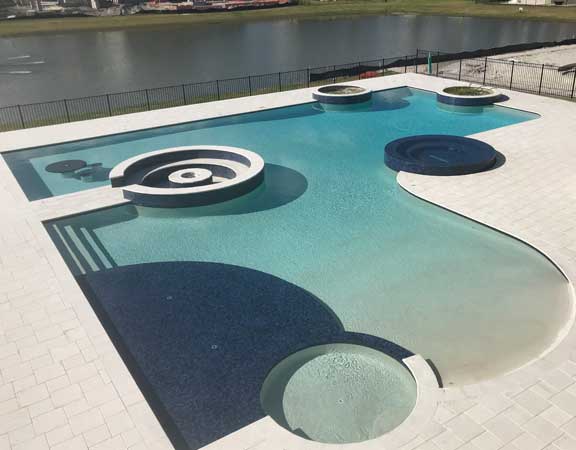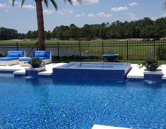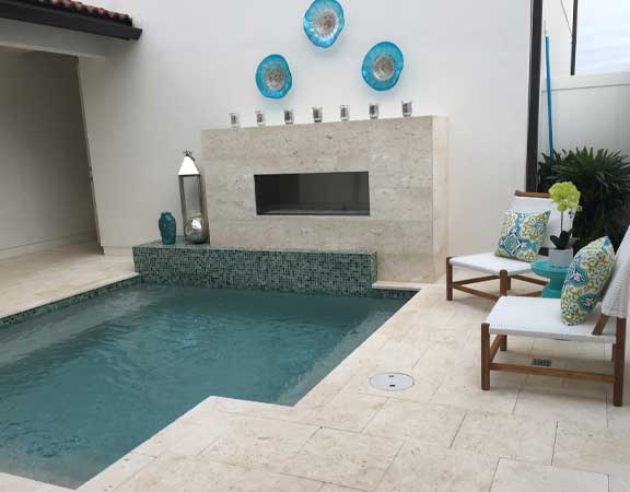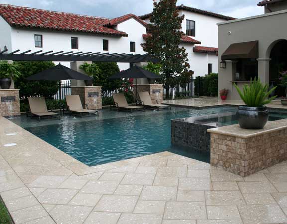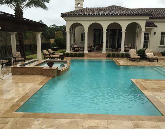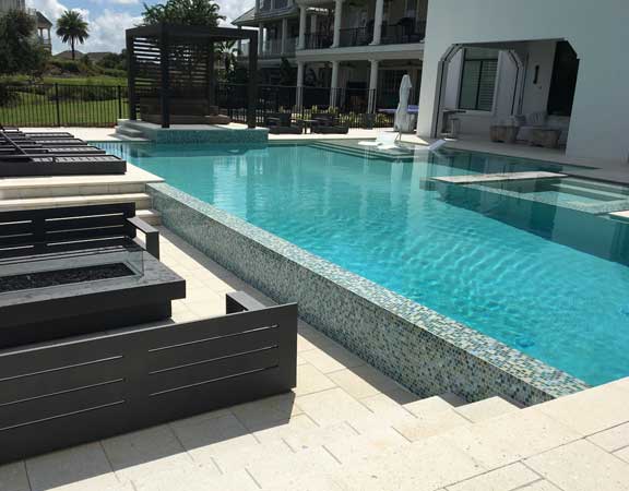 A linear or geometric pool design style tends to produce a very nice and clean look. The line pool design styles are usually accomplished with a combination of clean, straight lines and geometric shapes. The tiles are paved around the perimeter. The deck is brick, tile or stamped concrete. Ceramic, glass or mosaic tiles are added to the waterline.