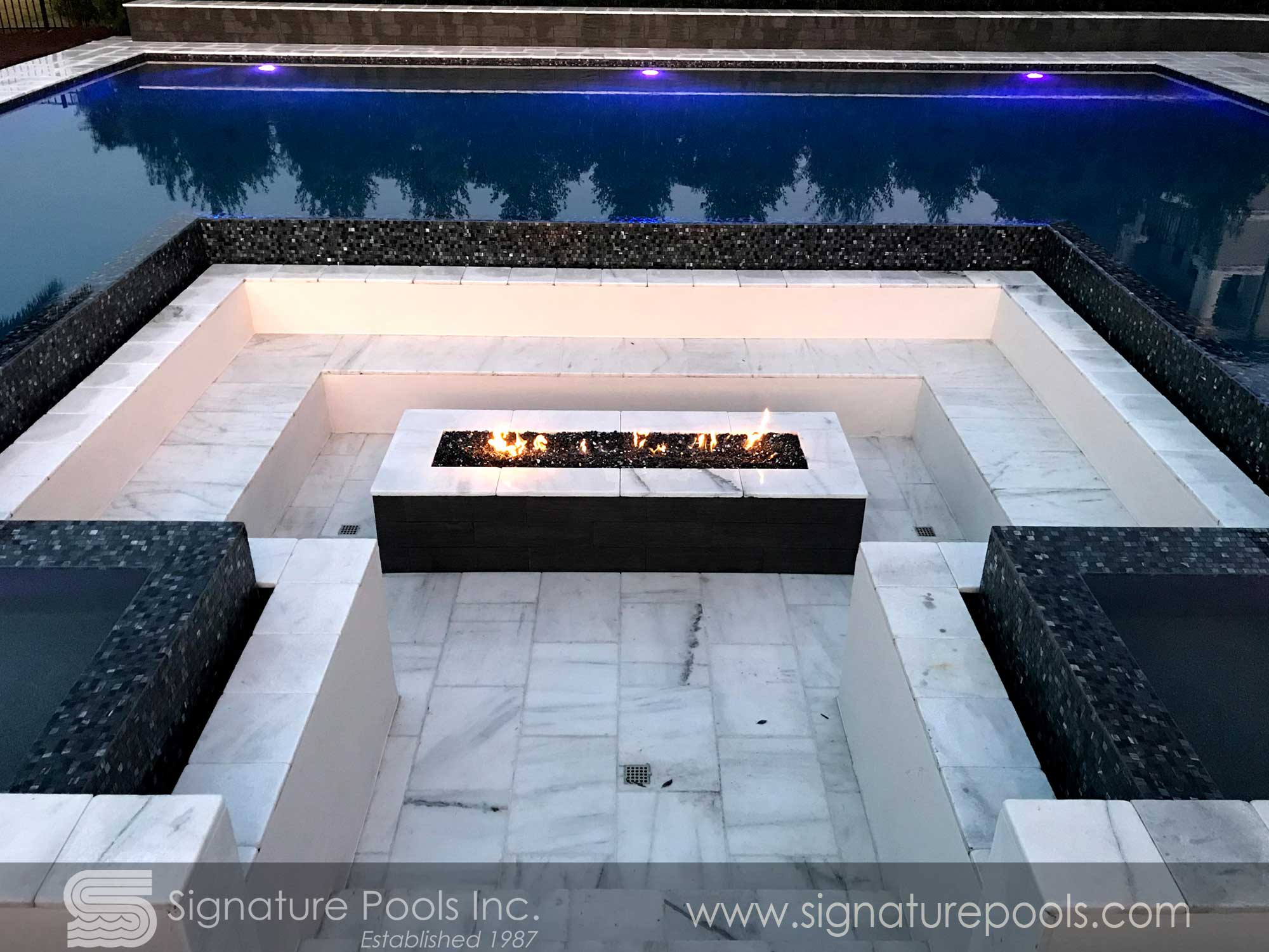 Linear Pool Design with Sunken Seating Fire Pit